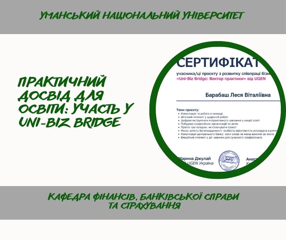 Кандидатки економічних наук, доцентки Леся БАРАБАШ і Наталія БОНДАРЕНКО взяли участь в онлайн-проєкті «Uni-biz Bridge: вектор практики», що об’єднав представників освіти та бізнесу навколо актуальних викликів сучасного ринку праці.