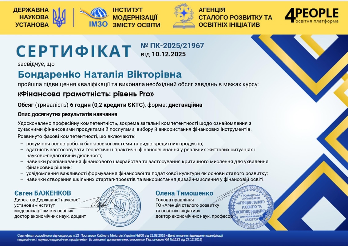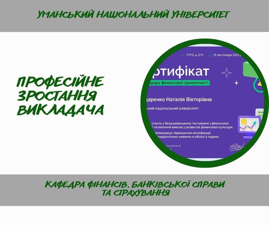 Доцентка кафедри фінансів, банківської справи та страхування Уманського національного університету Наталія БОНДАРЕНКО у межах підвищення кваліфікації завершила навчання за програмою «Фінансова грамотність: рівень Pro», що сприяло розвитку професійних компетентностей у сфері банківських продуктів, фінансової безпеки, податкової культури та практичного застосування фінансових знань в освітньому процесі.