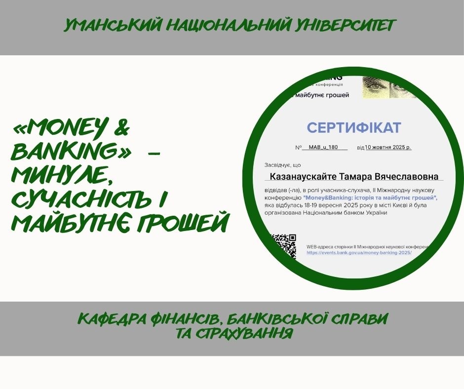 18–19 вересня 2025 року науково-педагогічні працівники та здобувачі освіти кафедри фінансів, банківської справи та страхування долучилися як учасники-слухачі до Ⅱ Міжнародної наукової конференції «Money & Banking: історія та майбутнє грошей», що відбулася у місті Києві на базі Музею грошей Національного банку України. Метою конференції стало формування постійного наукового майданчика для обговорення й оприлюднення результатів досліджень з актуальних питань історії грошового обігу та банківської справи в Європі.