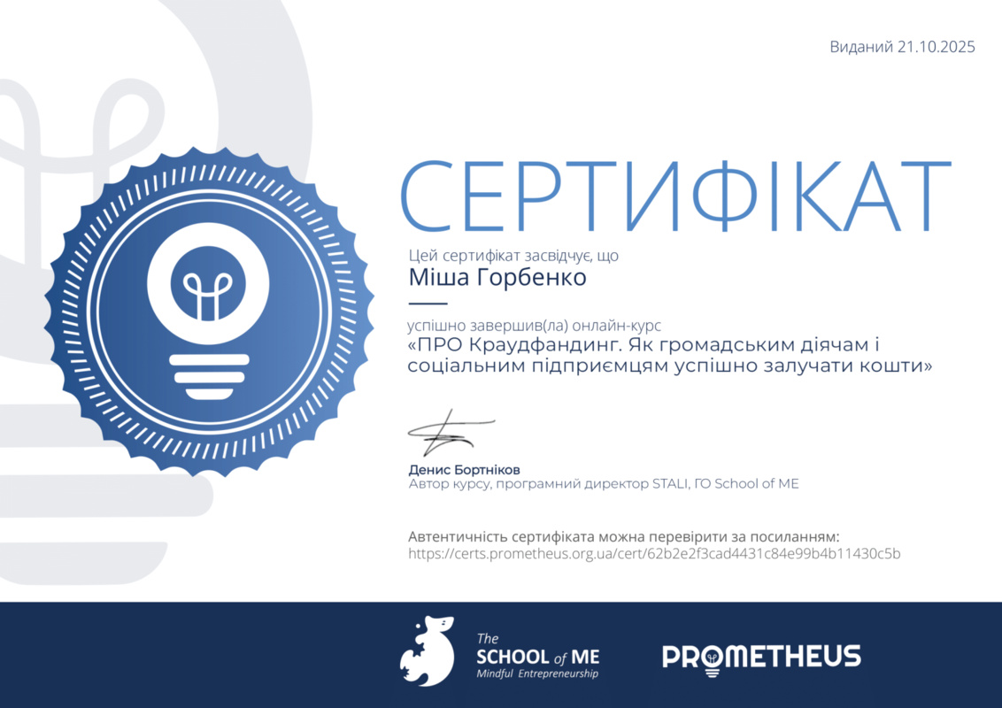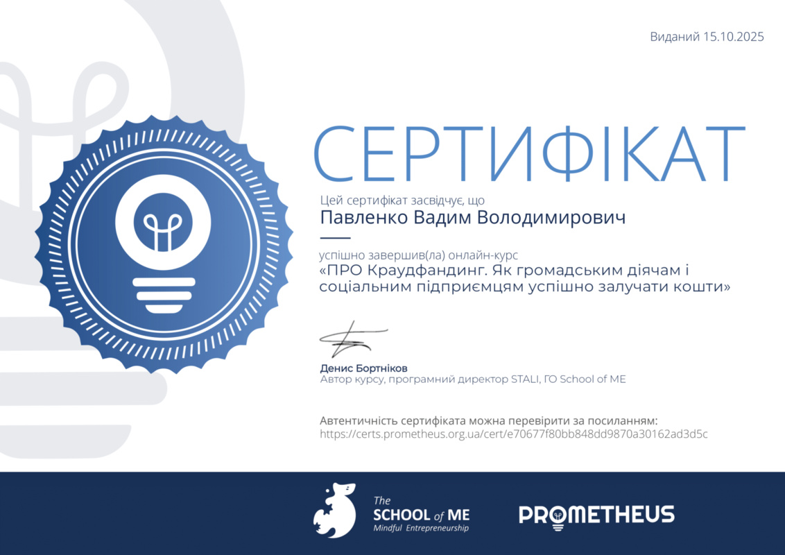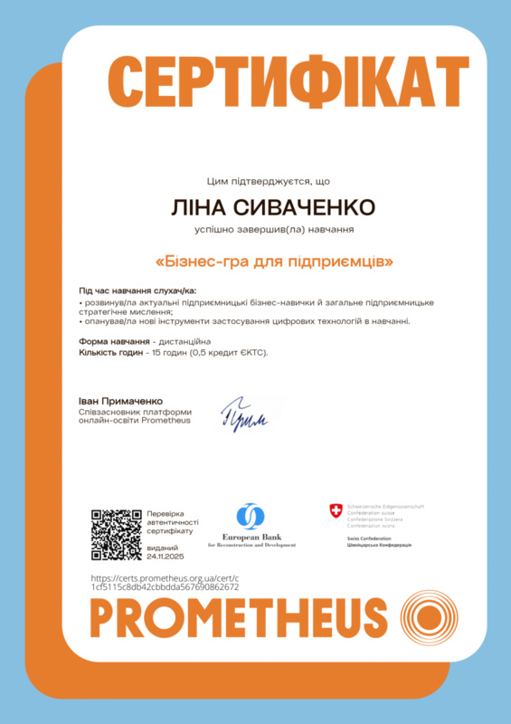 Підтвердженням здобутих компетенцій стали офіційні сертифікати, що свідчать про успішне завершення курсів та застосування отриманих знань на практиці.