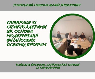 26 лютого на кафедрі фінансів, банківської справи та страхування УНУ відбулося засідання робочих груп, присвячене обговоренню проєктів освітніх програм за спеціальністю D2 «Фінанси, банківська справа, страхування та фондовий ринок» першого (бакалаврського), другого (магістерського) та третього (доктора філософії) рівнів вищої освіти.