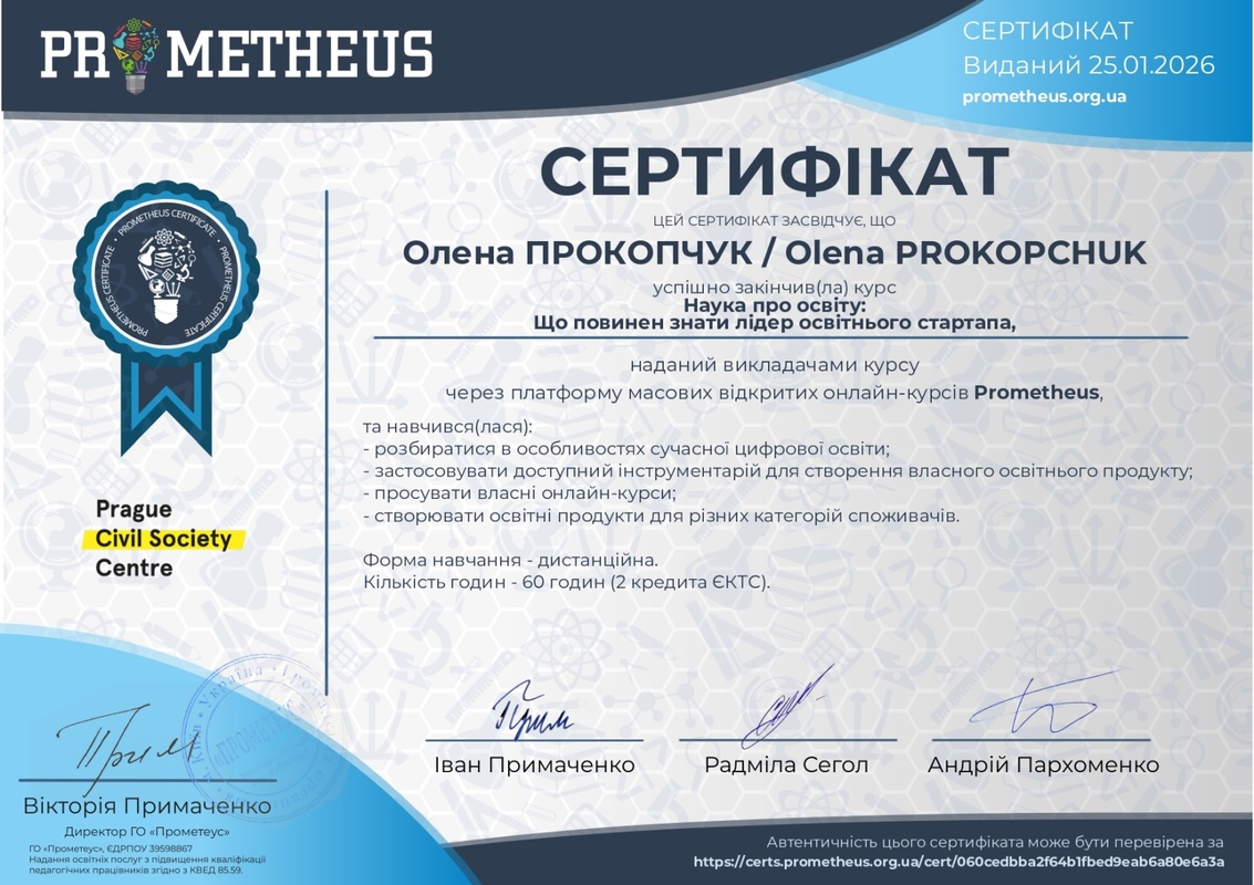 Завідувачка кафедри фінансів, банківської справи та страхування Уманського національного університету, д.е.н., професорка Олена ПРОКОПЧУК, активно розширює свої професійні та управлінські компетенції шляхом проходження сучасних курсів неформальної освіти на платформі Prometheus.