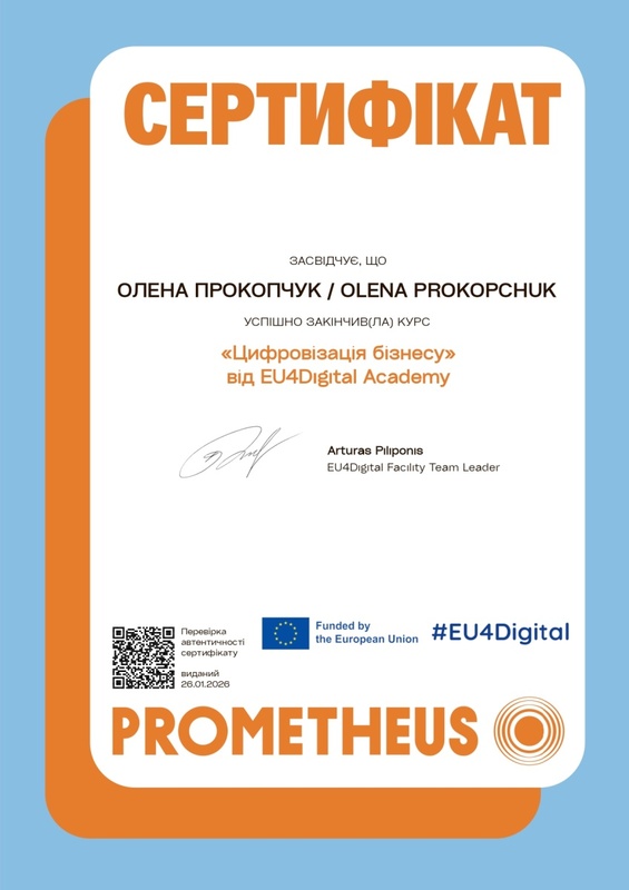- «Цифровізація бізнесу» – дозволив поглибити знання про цифрові інструменти та процеси трансформації бізнес-процесів;