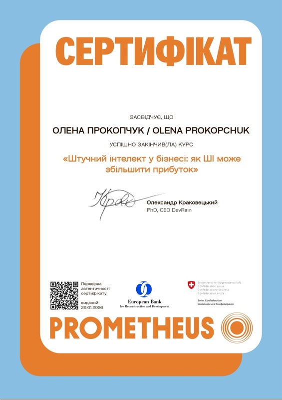 Пройдені курси дозволили Олені ПРОКОПЧУК поглибити управлінські знання та навички лідерства, підвищити ефективність організаційної діяльності кафедри, адаптуватися до сучасних викликів цифрової та академічної сфери та зміцнити експертизу у сферах фінансів, банківської справи, страхування та фондового ринку. Неформальна освіта стала важливим інструментом професійного розвитку, сприяючи підвищенню конкурентоспроможності університету та ефективності академічного менеджменту.