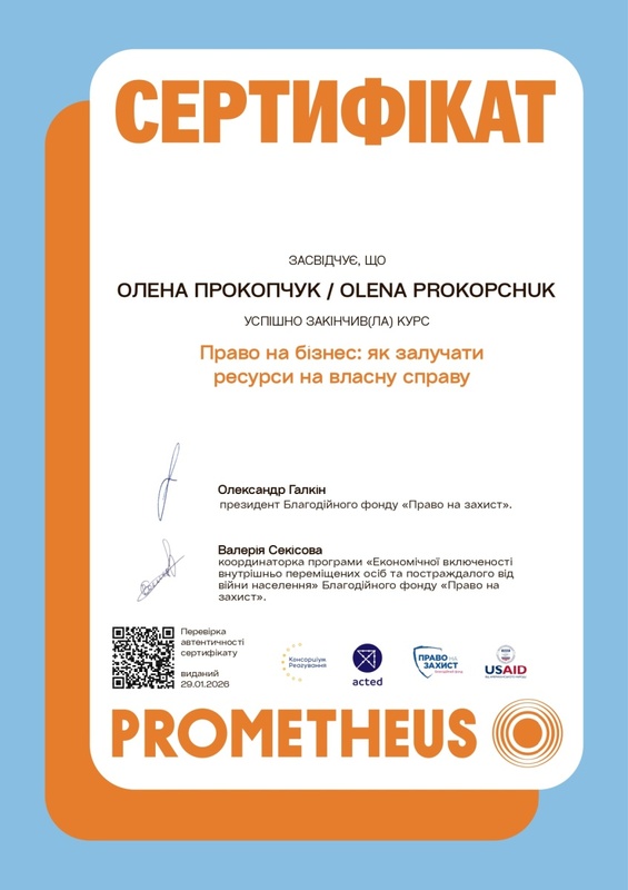 - «Право на бізнес: як залучати ресурси на власну справу» – покращив знання про юридичні аспекти підприємницької діяльності та залучення ресурсів.
