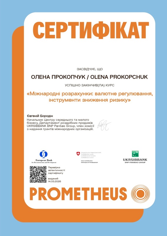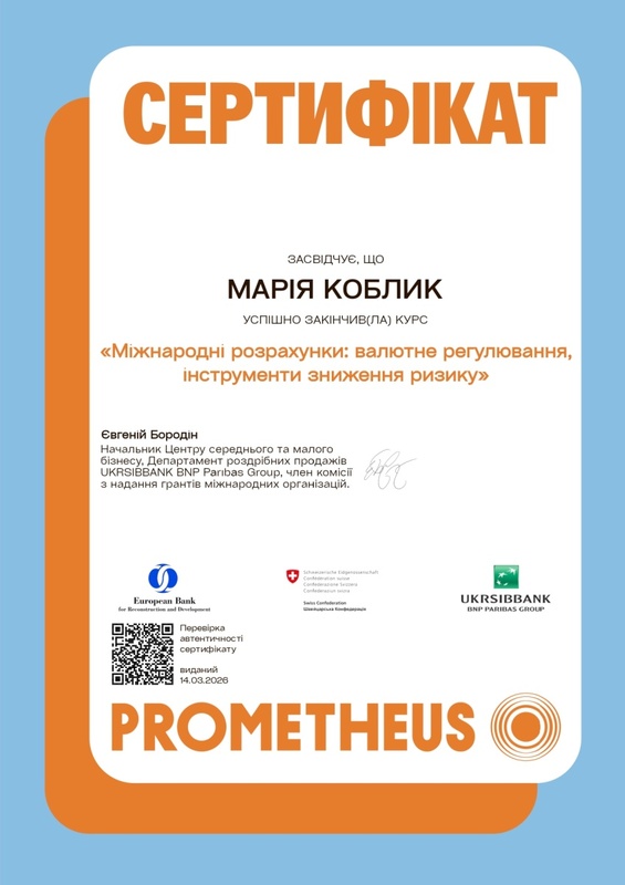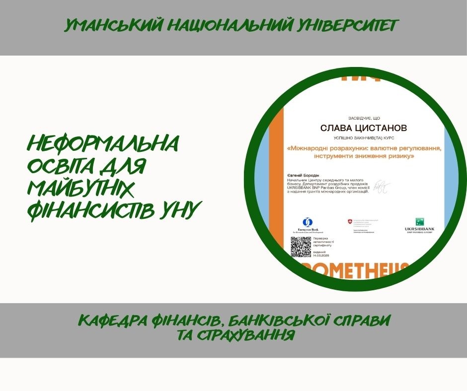 З метою розширення практичних навичок і опанування сучасних підходів до управління ризиками студенти долучилися до проходження курсів неформальної освіти на освітній платформі Prometheus, зокрема курсу «Міжнародні розрахунки: валютне регулювання, інструменти зниження ризику». Таке поєднання формальної та неформальної освіти дає можливість ширше поглянути на актуальні проблеми страхової діяльності та ознайомитися з сучасними інструментами зниження ризиків у фінансовій сфері.