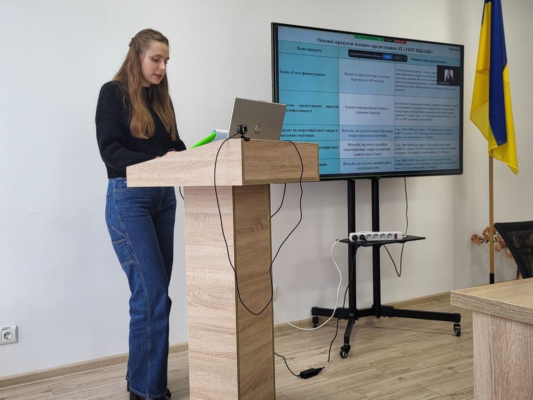 Олександра Романівна представила загалу доповідь на тему: «Трансформація банківського сектору в контексті сталого розвитку». Науковий керівник - к.е.н., доцент Наталія БОНДАРЕНКО.