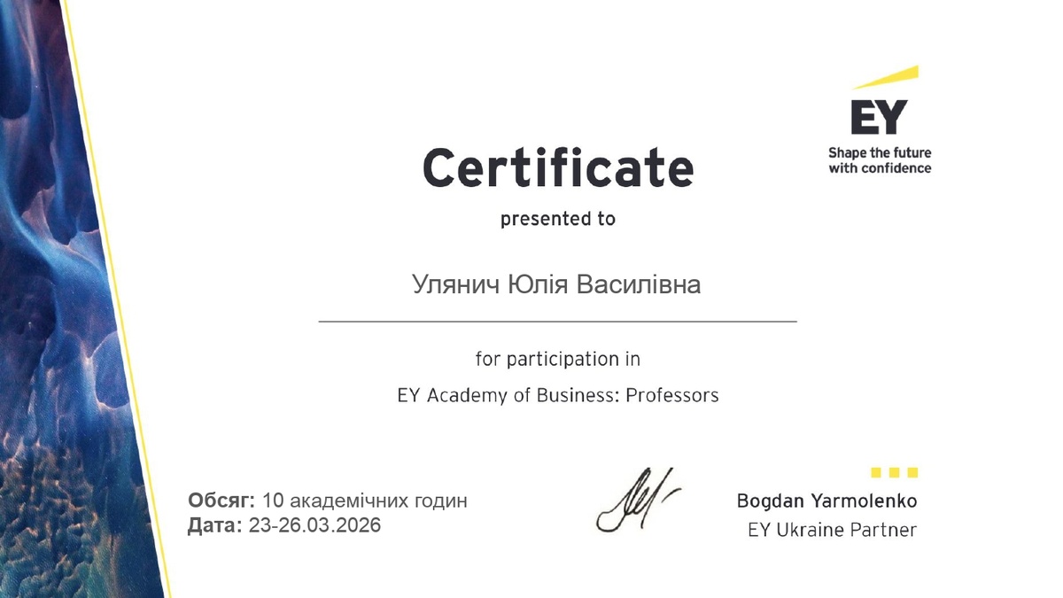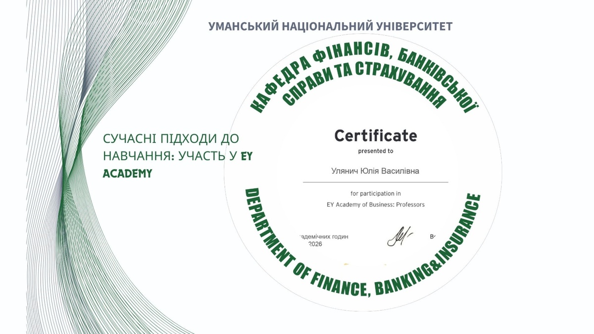 Викладачі кафедри фінансів, банківської справи та страхування Уманського національного університету долучилися до міжнародного освітнього проєкту EY Academy of Business, що став майданчиком для обміну сучасними педагогічними підходами та розвитку професійних компетентностей. До програми долучилися професор Олена Прокопчук, доцентки Наталія Бондаренко та Юлія Улянич. Упродовж навчального інтенсиву учасники опрацювали ключові напрями, що поєднують академічну підготовку з практикою сучасного бізнес-середовища.