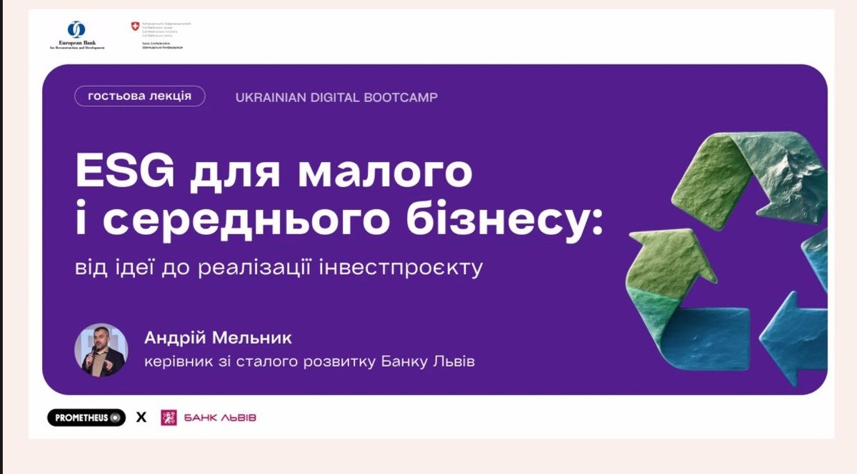 Викладачі кафедри фінансів, банківської справи та страхування долучилися як слухачі до гостьової лекції «ESG для малого та середнього бізнесу: від ідеї до реалізації інвестпроєкту». Захід був організований платформою Prometheus у межах Ukrainian Digital Bootcamp за підтримки ЄБРР та. Партнером виступив Банк Львів.