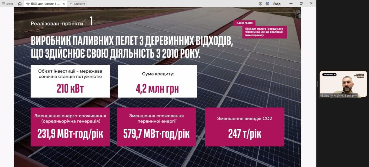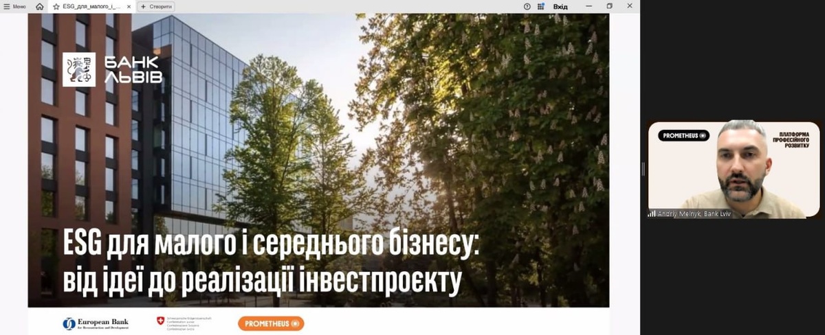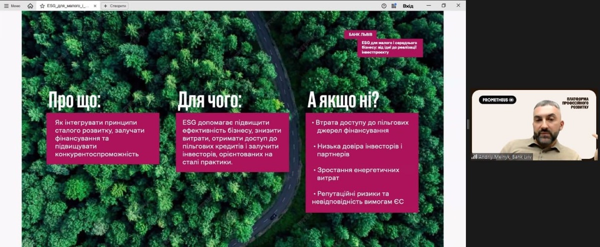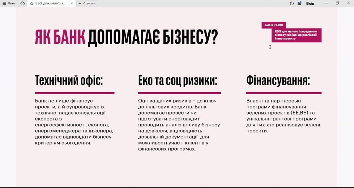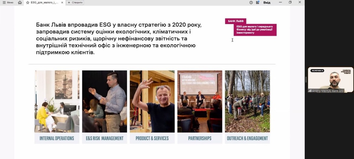 - o досвідом Банку Львів у роботі з ESG-ризиками та фінансуванні зелених проєктів;