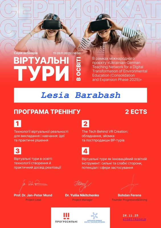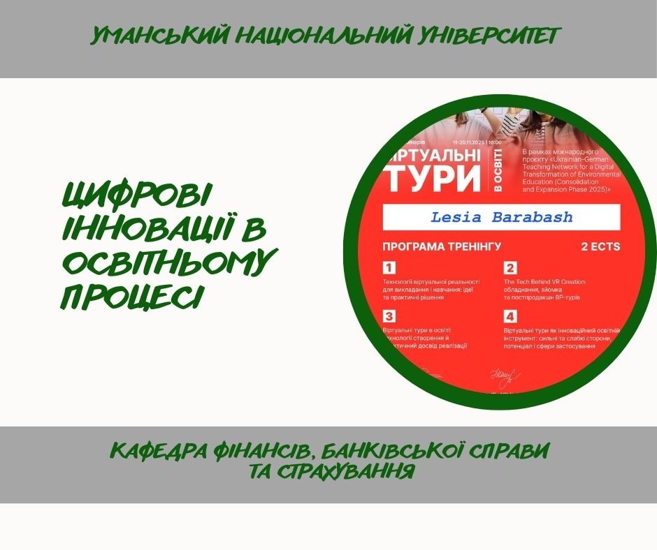 Викладачі кафедри фінансів, банківської справи та страхування Леся БАРАБАШ і Світлана ВЛАСЮК взяли участь у серії вебінарів «Віртуальні тури в освіті», що реалізовувалися у рамках міжнародного проєкту «Ukrainian – German Teaching Network for a Digital Transformation of Environmental Education (Consolidation and Expansion Phase 2025)»/