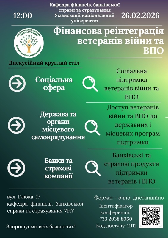 Кафедра фінансів, банківської справи та страхування щиро запрошує взяти участь у роботі круглого столу на тему: «Фінансова реінтеграція ветеранів війни та внутрішньо переміщених осіб», що відбудеться 26 лютого 2026 року о 12:00.
